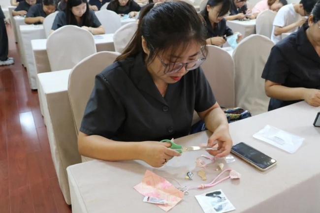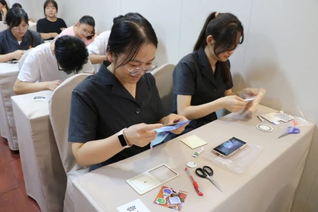“这个花纹真好看,像画里的一样!”干警们忍不住赞叹。大家坐在一起,有的小心翼翼地将宋锦布料固定在骨架上,有的认真挑选着搭配的颜色,还有的互相交流着制作心得,现场氛围温馨而热闹。经过一个小时的精心制作,一个个独具特色的手工作品就诞生了。