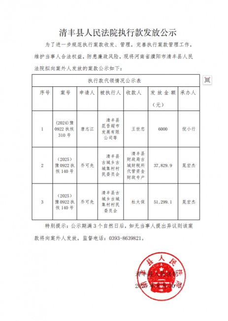 清丰县人民法院执行款发放公示