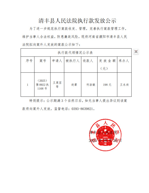 清丰县人民法院执行款发放公示