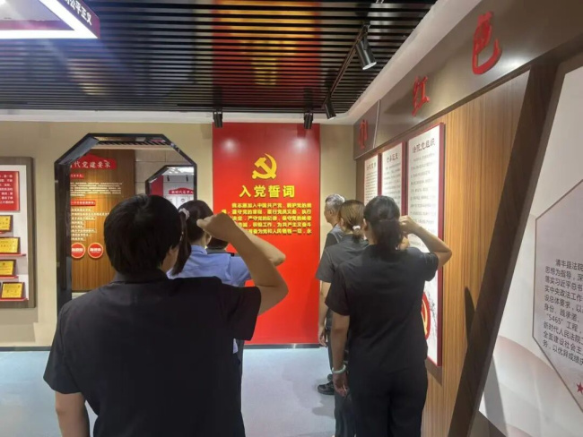 “我志愿加入中国共产党,拥护党的纲领……”立案庭全体党员干警面向党旗庄严宣誓,唤醒入党时的赤诚初心。随后,支部组织观看红色电影,以鲜活党史故事传递信仰力量,引导党员干警赓续红色血脉,厚植“司法为民、公正司法”的责任意识,在光影中汲取奋进动力,让党性修养在情感共鸣中持续升温。