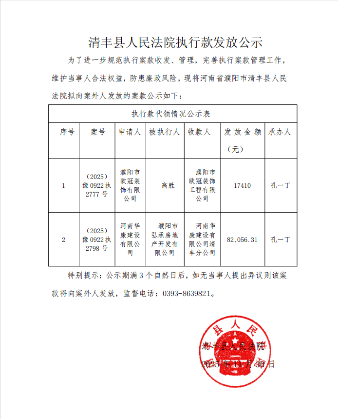 清丰县人民法院执行款发放公示
