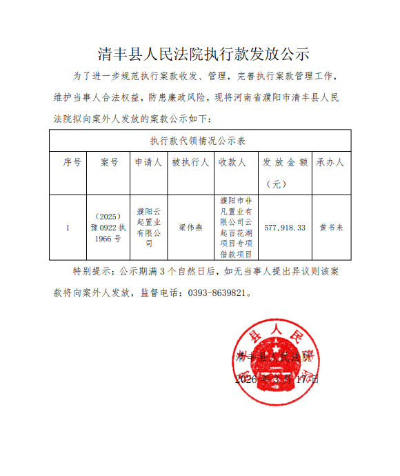 清丰县人民法院执行款发放公示