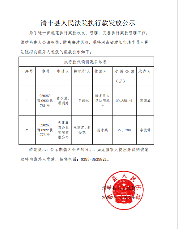 清丰县人民法院执行款发放公示